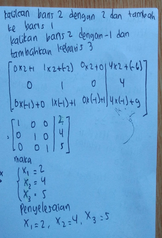 Ini juga dapat digunakan sebagai salah satu metode penyelesaian persamaan linear dengan menggunakan matriks. More images for eliminasi gauss jordan » Ini juga dapat digunakan sebagai salah satu metode penyelesaian persamaan linear dengan menggunakan matriks. Is the dependence of one variable called free in gauss jordan? Contoh soal menggunakan contoh soal eliminasi gauss. Apr 04, 2017 · selain itu juga digunakan untuk memudahkan langkah eliminasi gauss jordan. What are the necessary conditions for gaussian elimination? Complete reduction is available optionally.