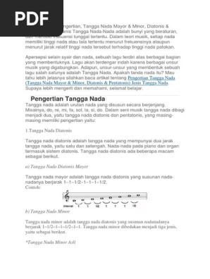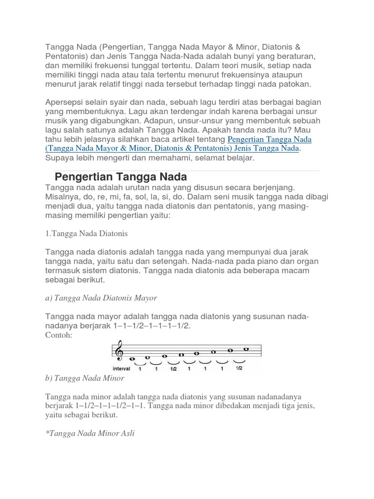 Ada yang jaraknya 1/2, 1, 1 1/2, dan 2. Tangga nada ini memiliki perbedaan jarak interval yang besar. Nada slendro digunakan untuk memberikan kesan gembira dan lincah (sumber: 1 (ji), 2 (ro), 3 (lu), 4 (pat), 5 (mo), 6 (nem) dan 7 (pi). Tangga nada pentatonis sendiri terbagi lagi atas dua tangga nada, yaitu pelog dan slendro. Tangga nada pentatonis slendro bersifat gembira, semangat, dan kadang fantastis. Tangga nada pelog hanya memiliki lima nada primer, yakni do, mi, fa, sol, si. Jika dibandingkan dengan tangga nada diatonis, susunan tangga nada pelog kurang lebih sama dengan susunan. Berikut soal pertama dan jawabannya: Nada diatonis disusun terdiri dari 7 komposisi nada primer dengan interval 1 atau setengah setiap nadanya. Penggunaan tangga nada diatonis adalah daerah indonesia bagian timur sedangkan untuk jawa, bali dan sunda menggunakan tangga nada pentatonis. Sistem tangga nada jawa secara umum dibagi dalam dua sebutan, yakni sistem tangga nada pelog dan slendro. Sementara itu tangga nada slendro terdiri dari nada: